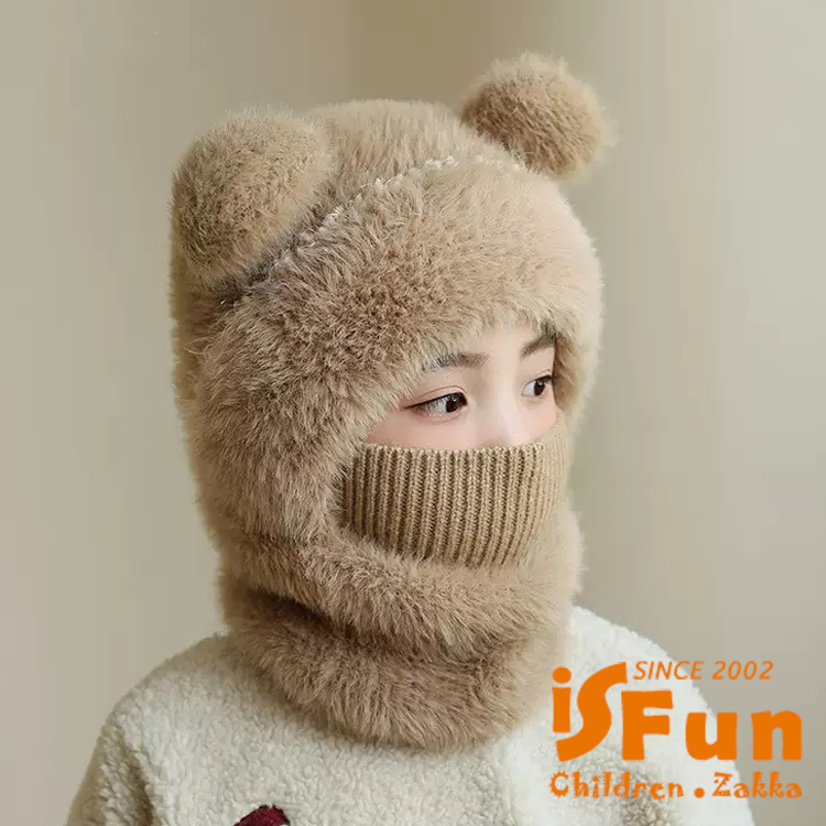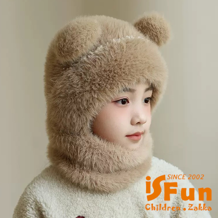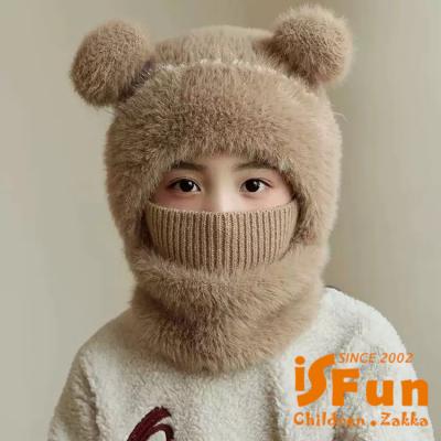 【iSFun】小熊耳朵 兒童秋冬毛絨針織圍巾一體帽/卡其