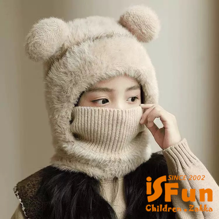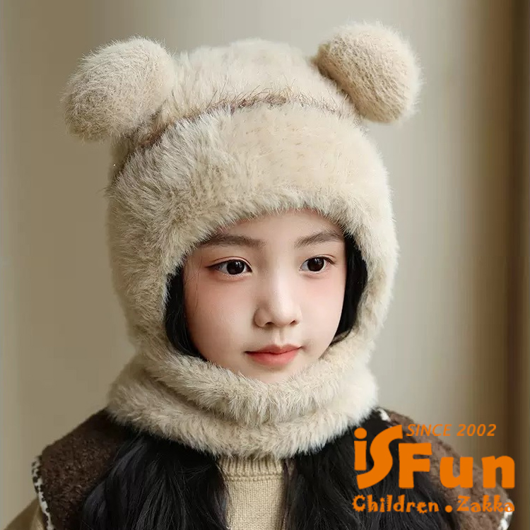 【iSFun】小熊耳朵 兒童秋冬毛絨針織圍巾一體帽/米色