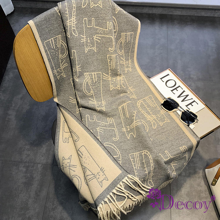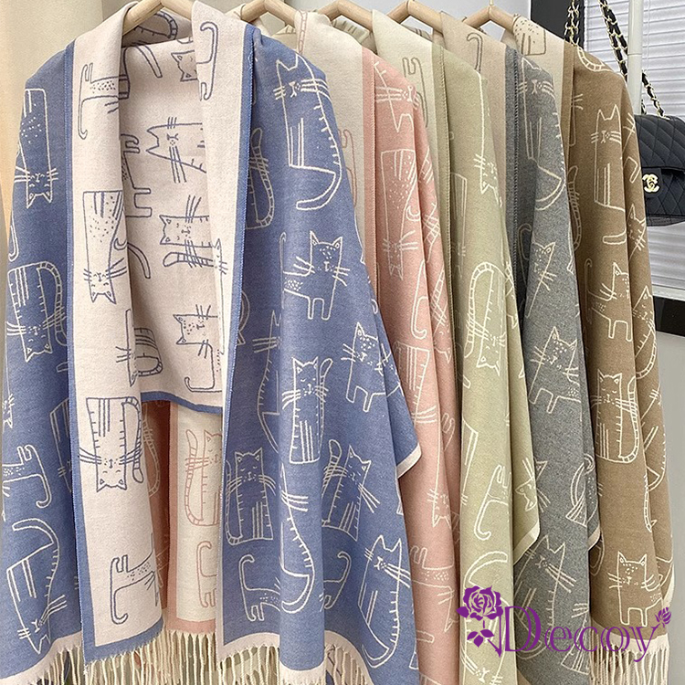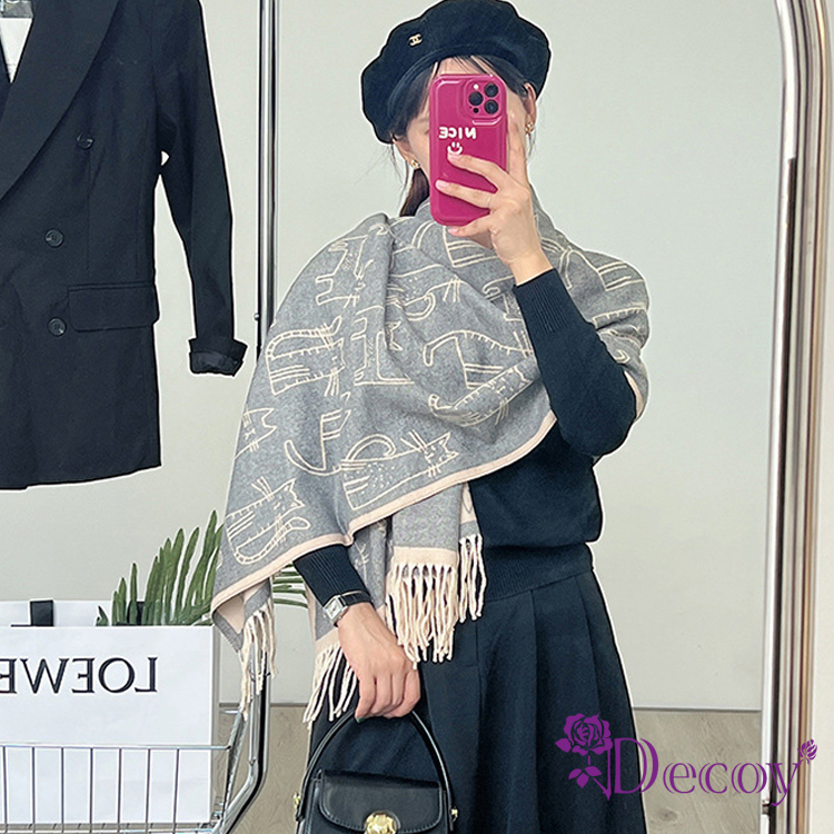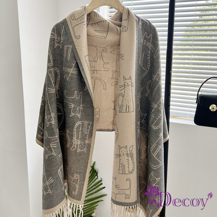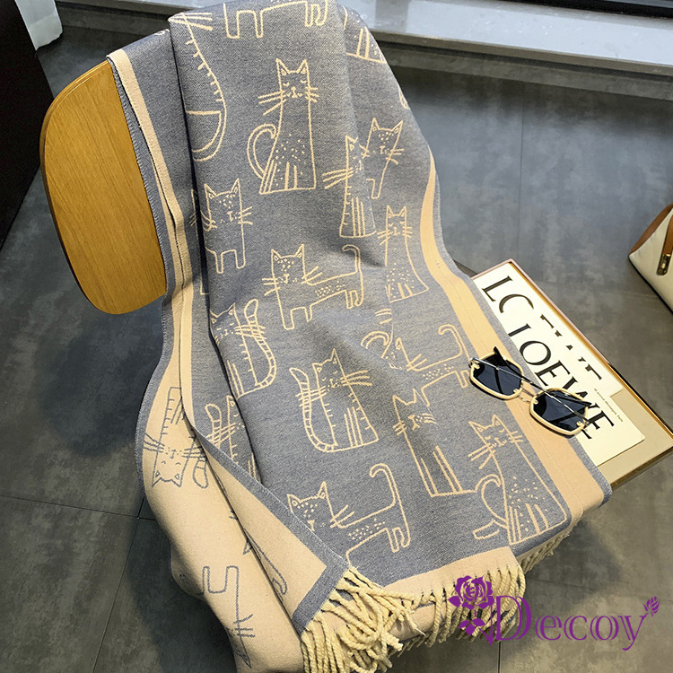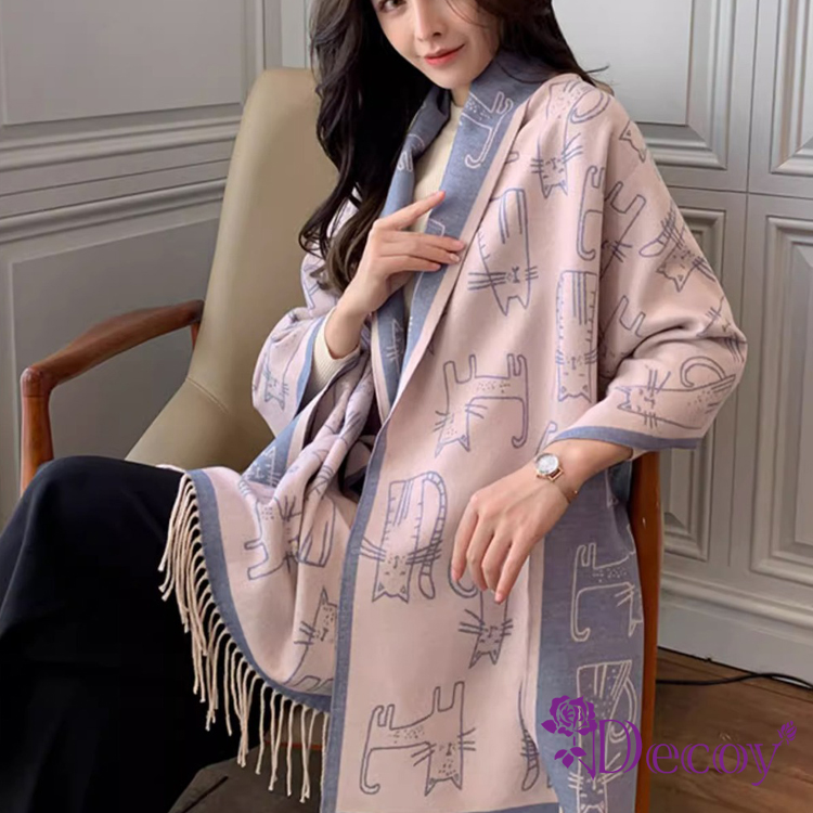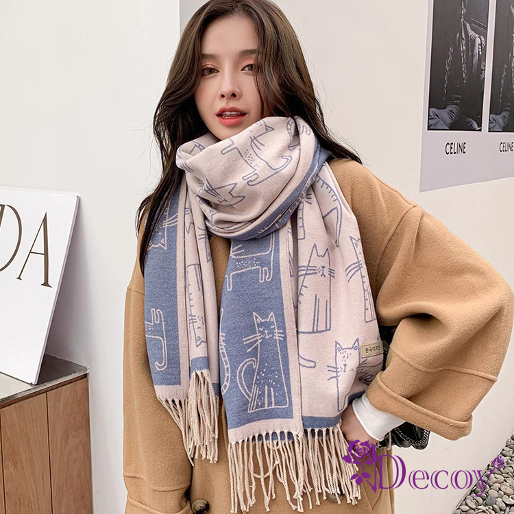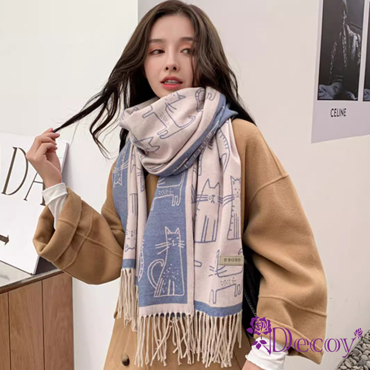 【Decoy】貓咪線條*保暖撞色加大流蘇披肩圍巾/藍米