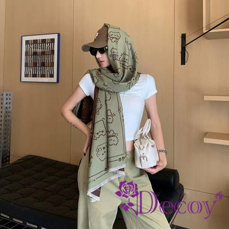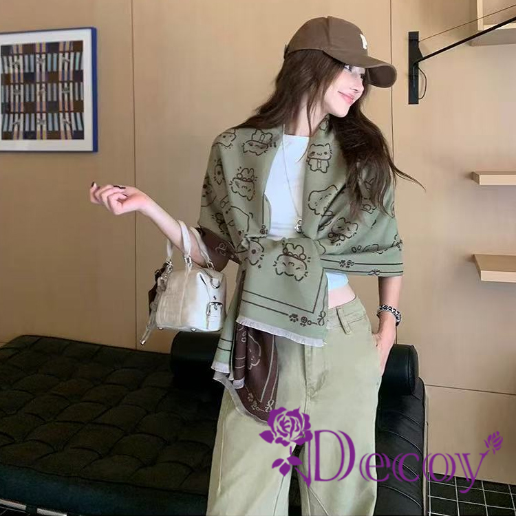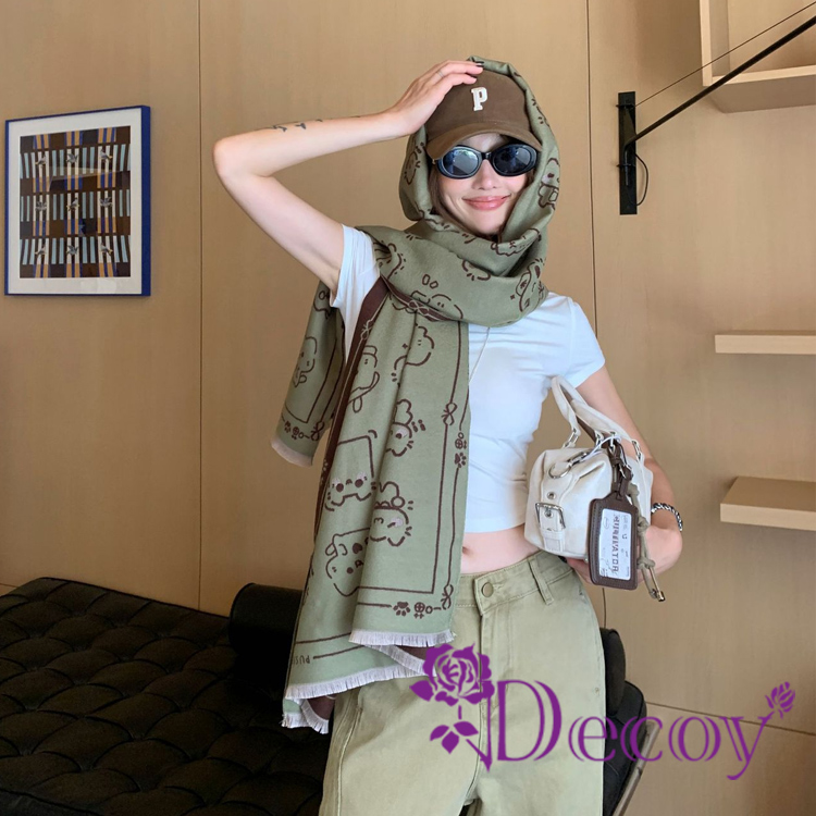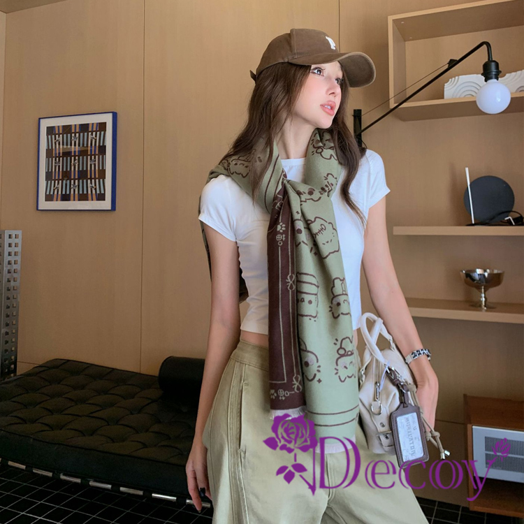 【Decoy】俏皮萌貓 雙面印花仿羊絨披肩圍巾/綠咖啡
