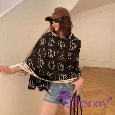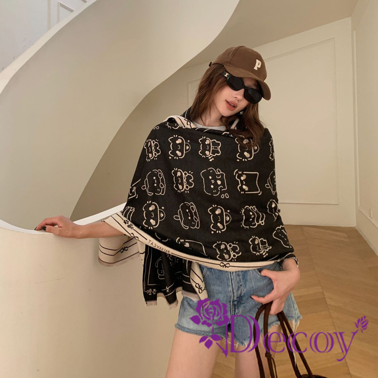 【Decoy】俏皮萌貓 雙面印花仿羊絨披肩圍巾/黑白色