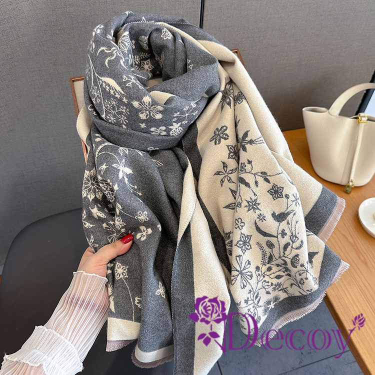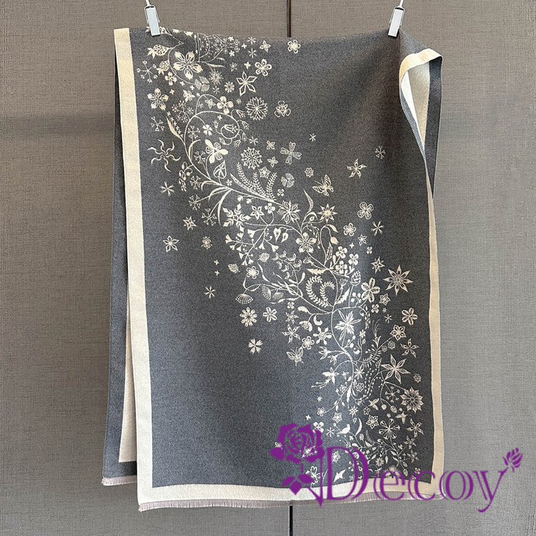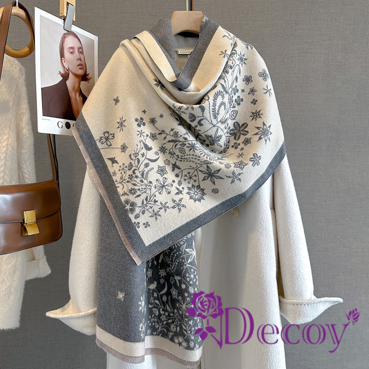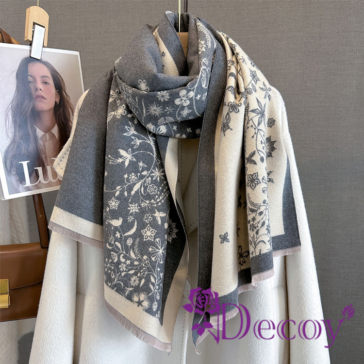 【Decoy】沿路生花 雙面印花仿羊絨披肩圍巾/灰