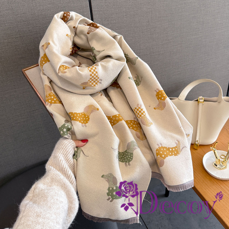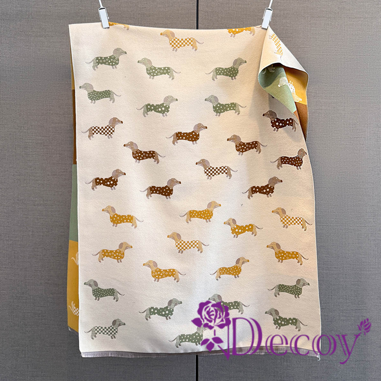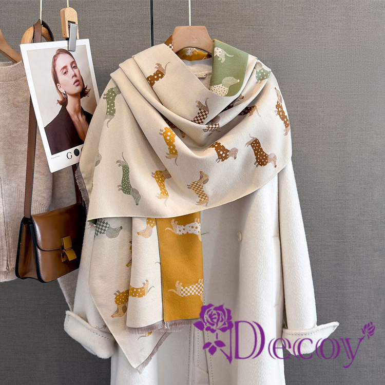 【Decoy】臘腸小狗 雙面印花仿羊絨披肩圍巾/米白