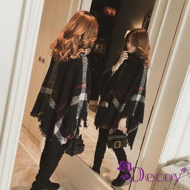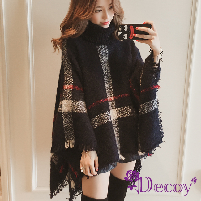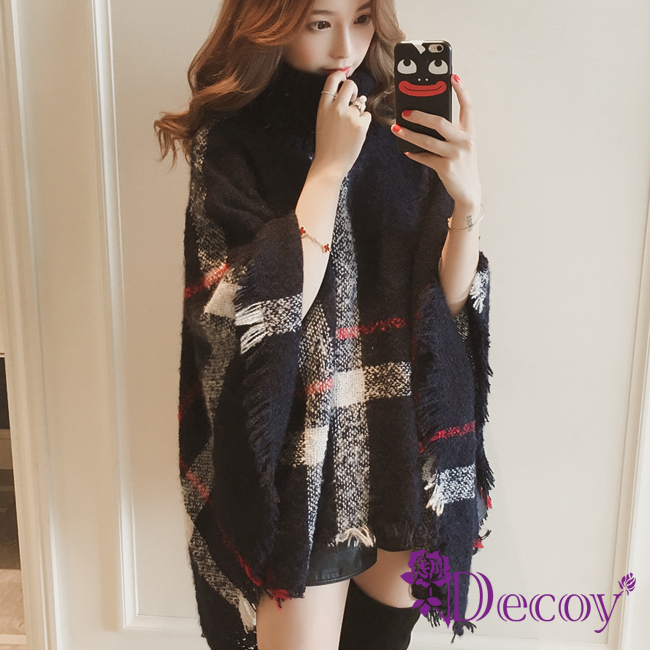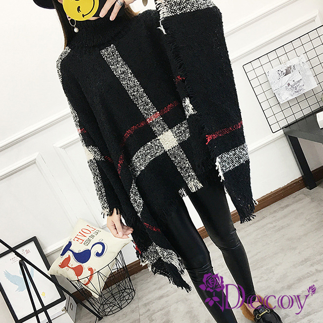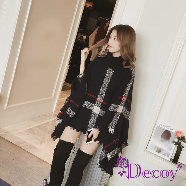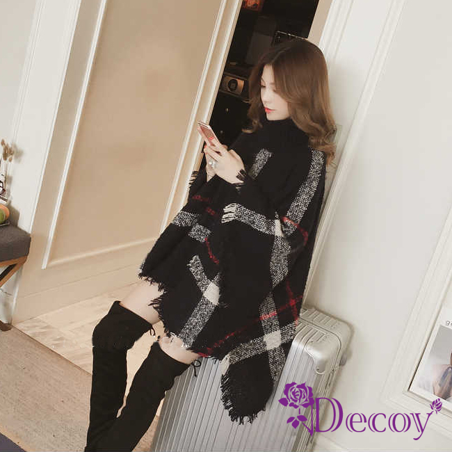 【Decoy】精品格紋*保暖高針織領毛衣斗篷披肩/黑