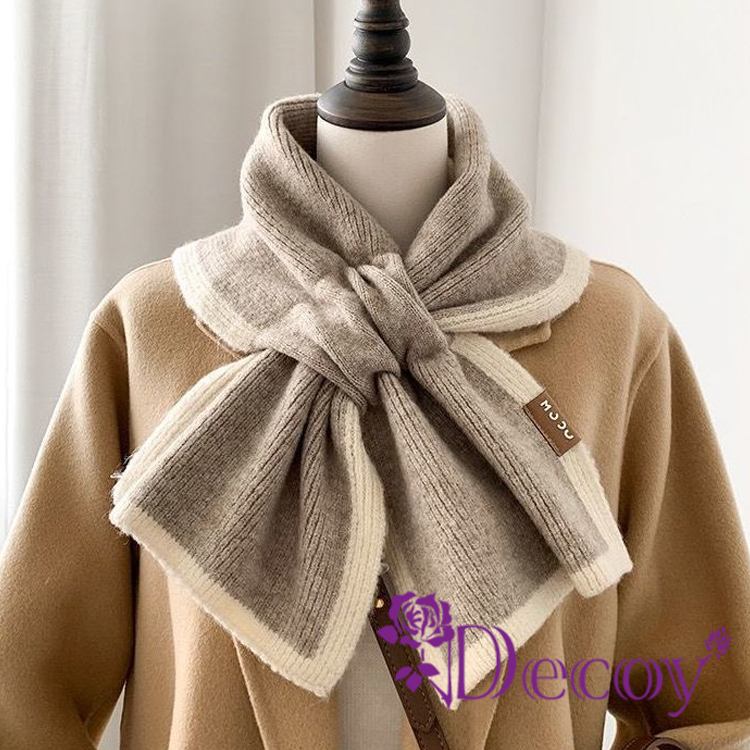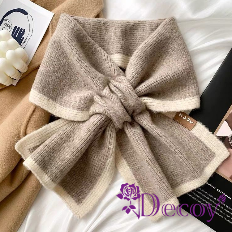 【Decoy】撞色蝴蝶結 保暖仿羊絨交叉脖圍圍巾/卡其米