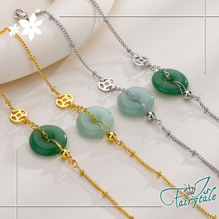 中國風格轉運手鍊,淺綠和田玉銅錢造型,