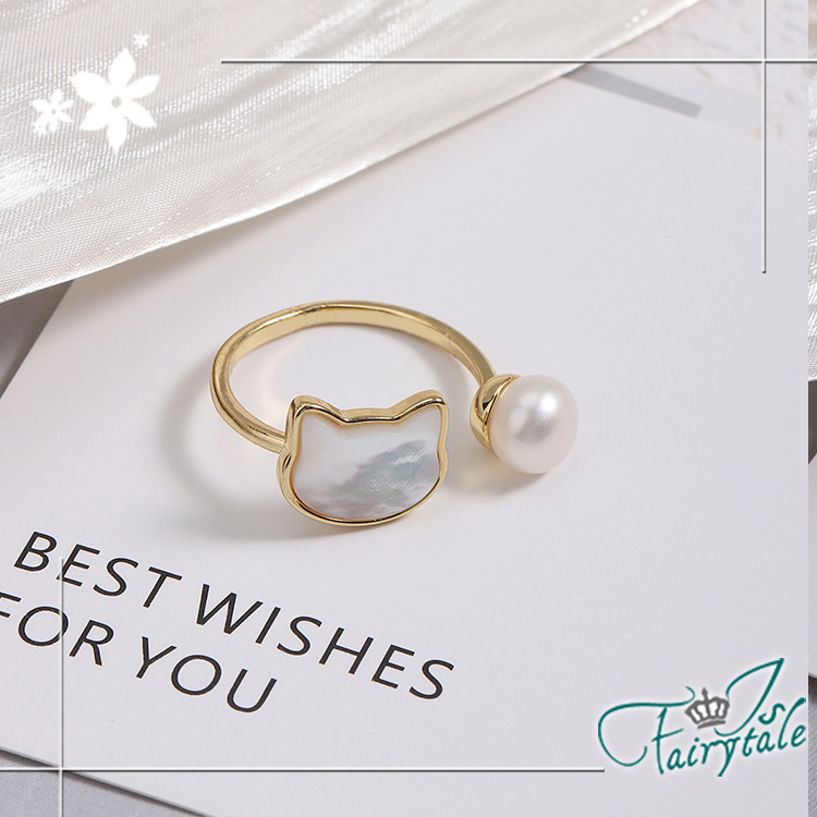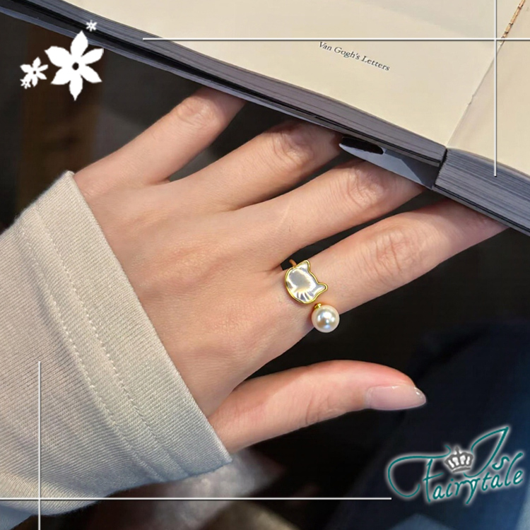 【伊飾童話】極光白貝 萌貓天然珍珠開口彈性戒指/金