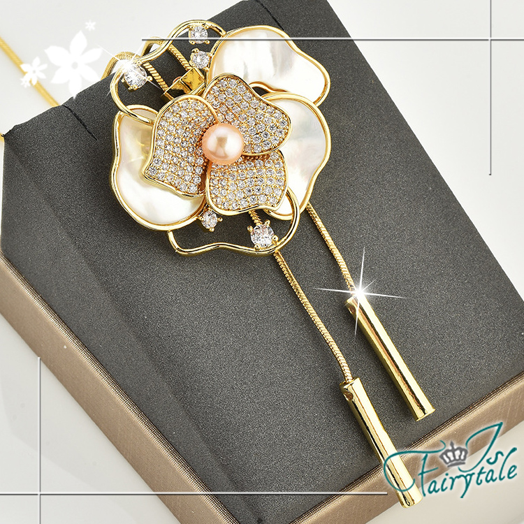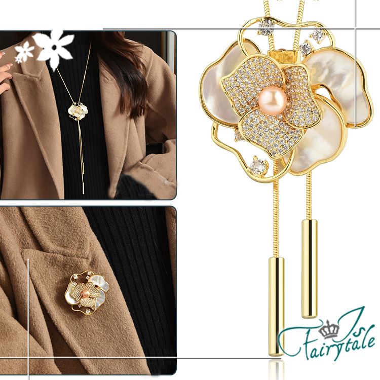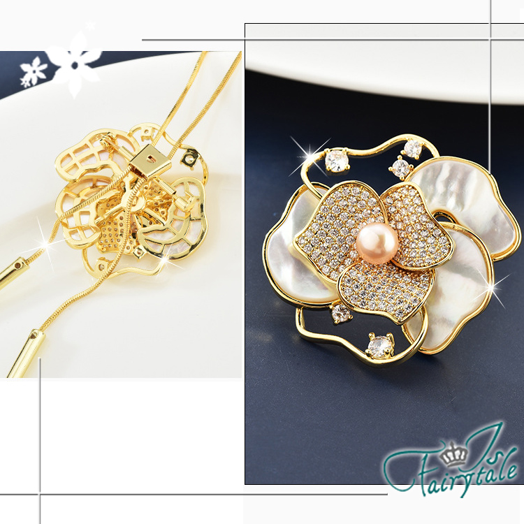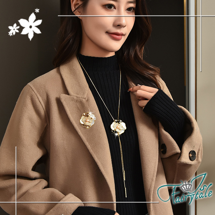 【伊飾童話】鏤空山茶 水鑽珍珠二合一胸針伸縮長鍊
