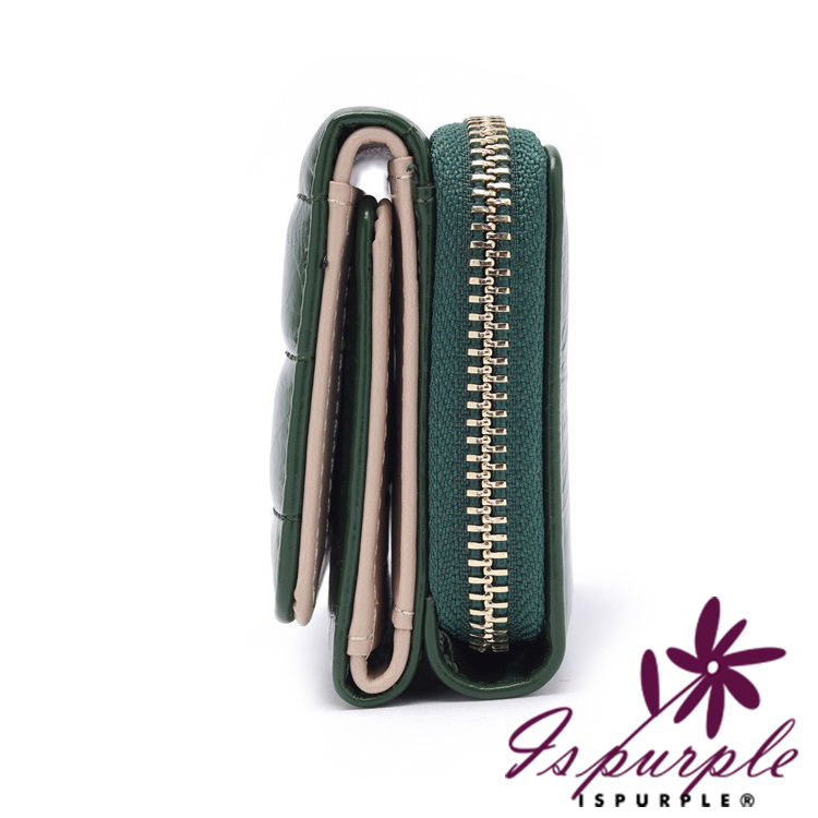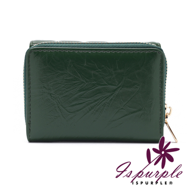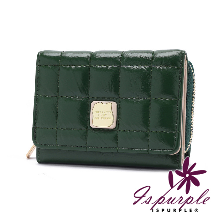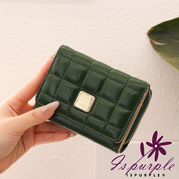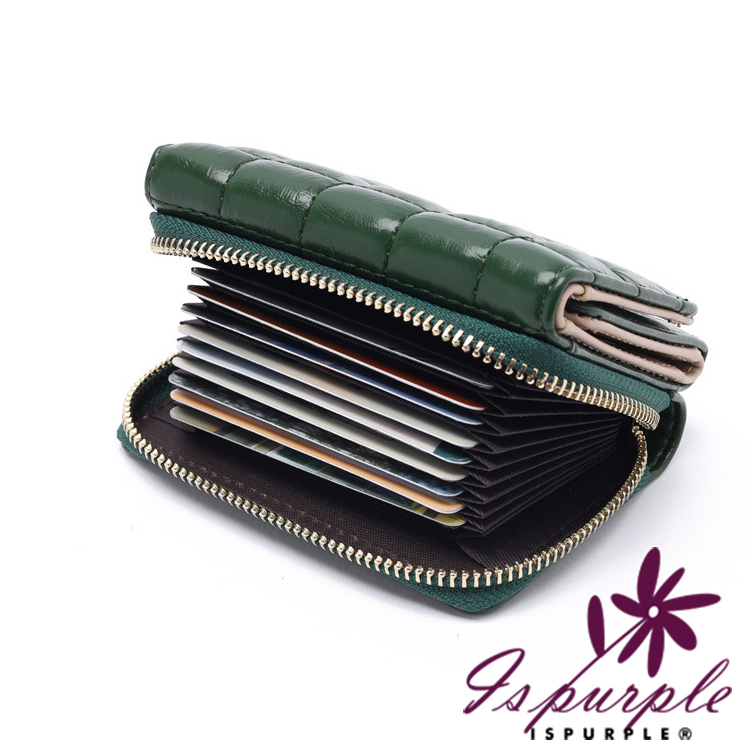 【iSPurple】方型格紋 韓風亮面皮革零錢卡片風琴短夾/綠