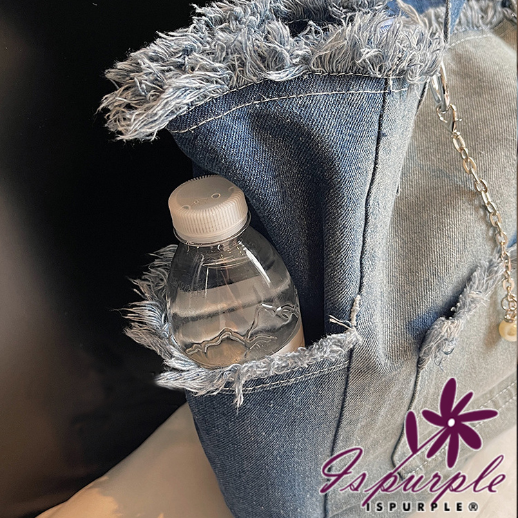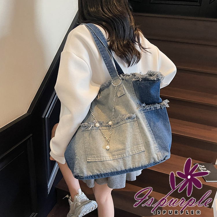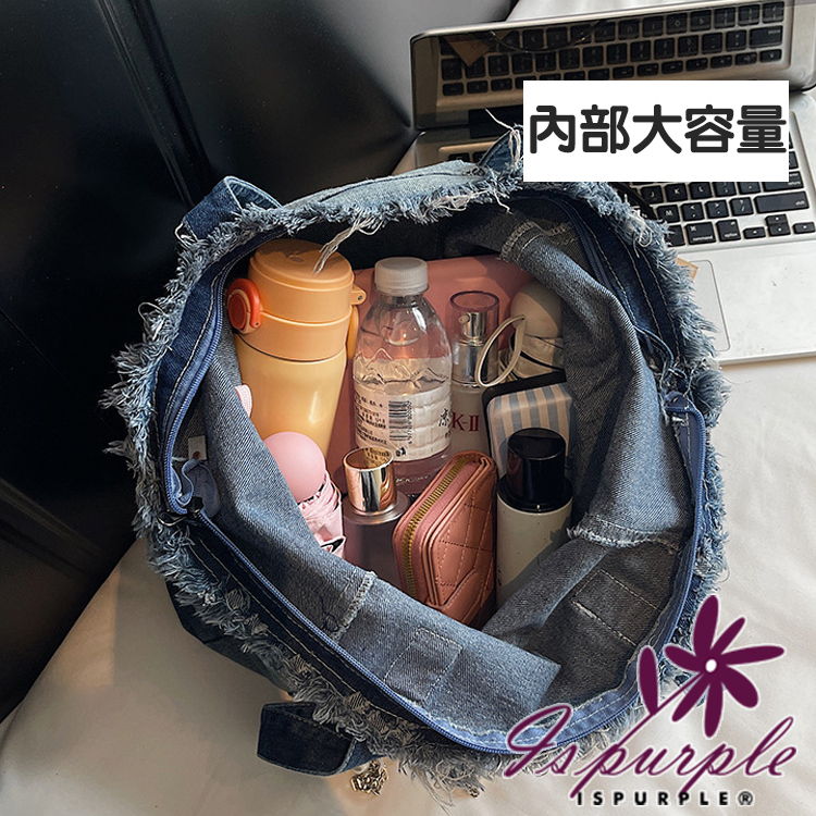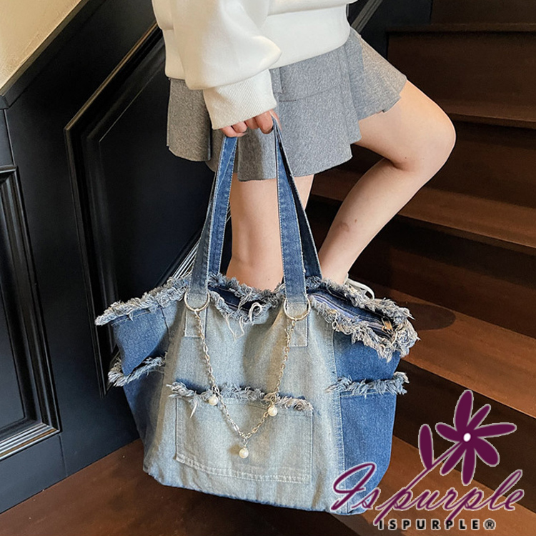 【iSPurple】復古百搭 大容量牛仔抽鬚通勤托特包/藍