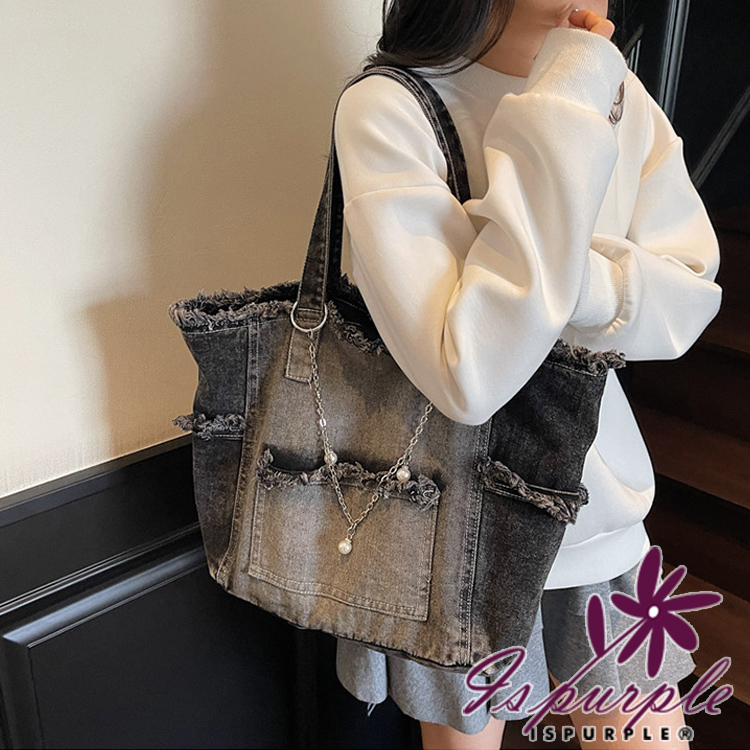 【iSPurple】復古百搭 大容量牛仔抽鬚通勤托特包/黑