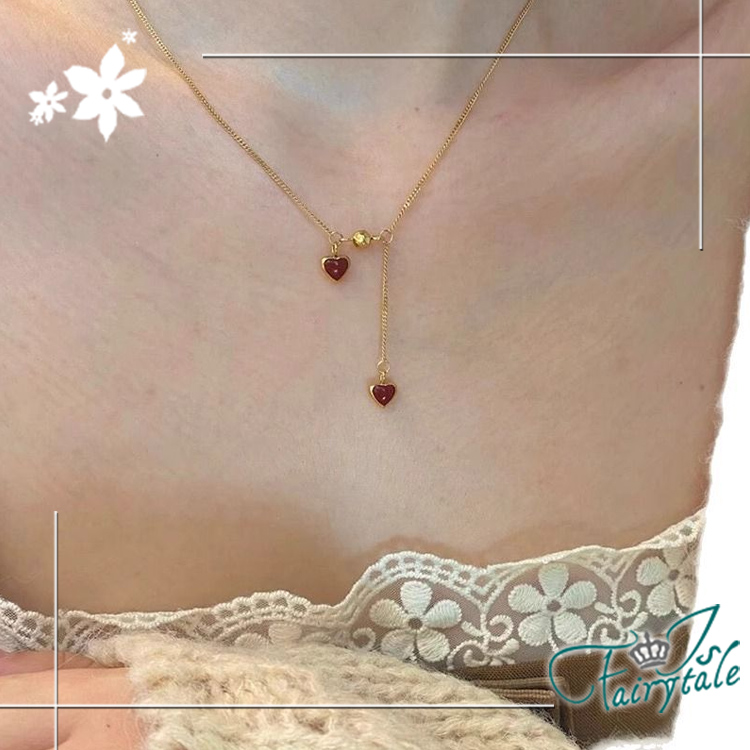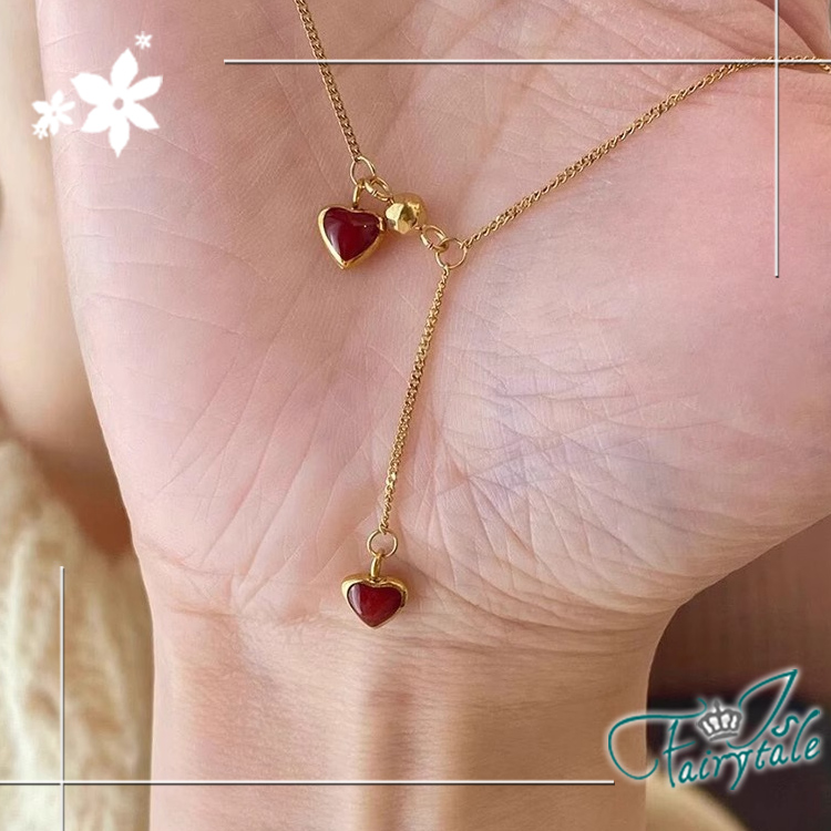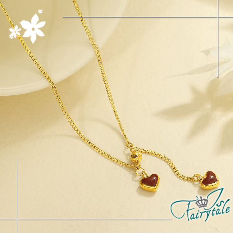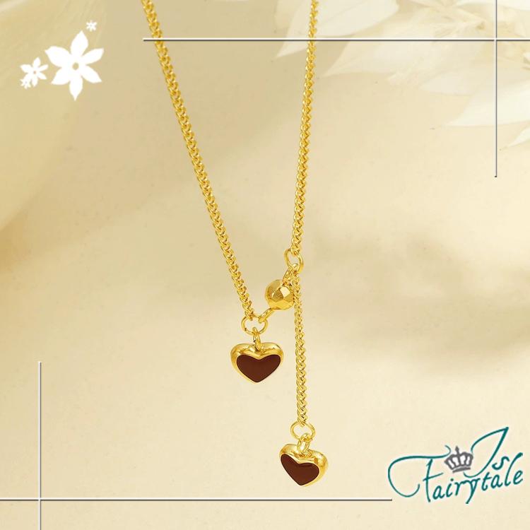 【伊飾童話】復古雙心 不對稱滴油流蘇鈦鋼短項鍊/金