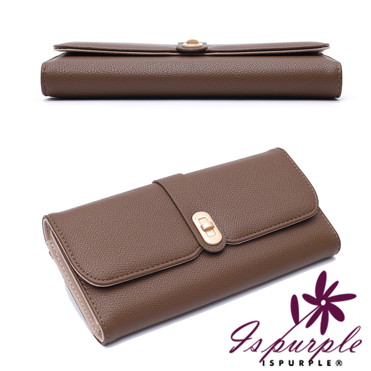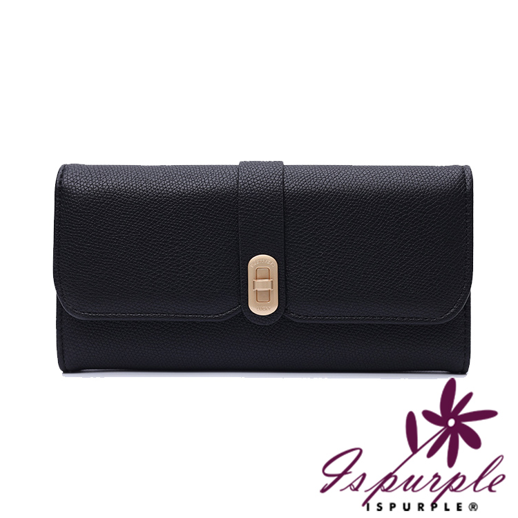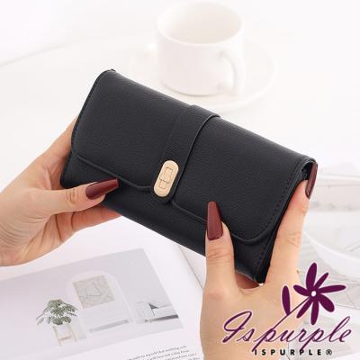 【iSPurple】清新純色 三折荔枝紋皮金釦長夾/黑色