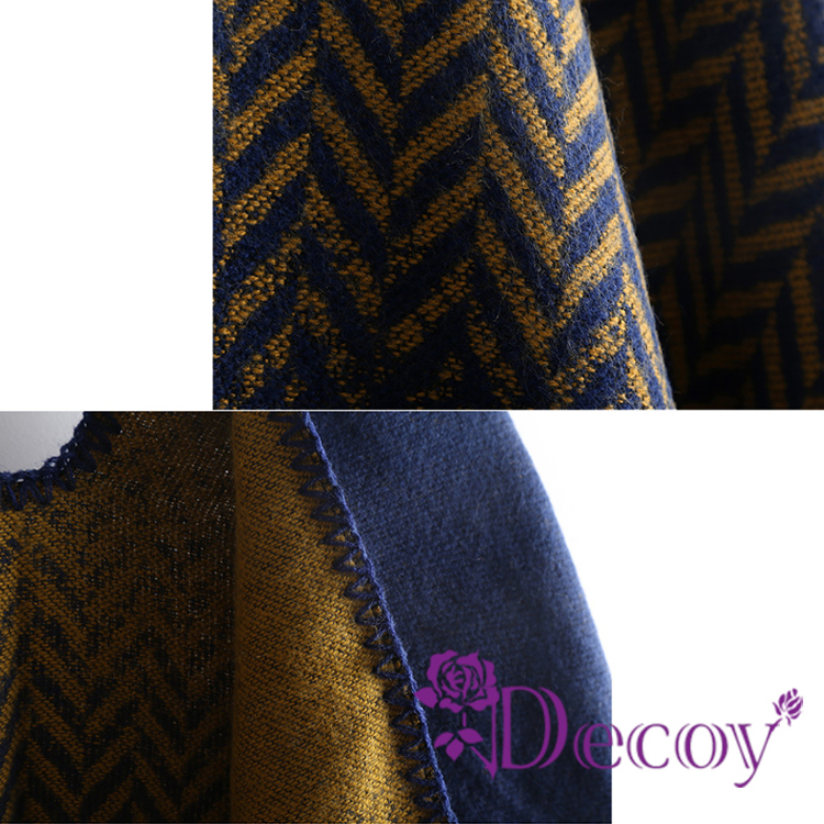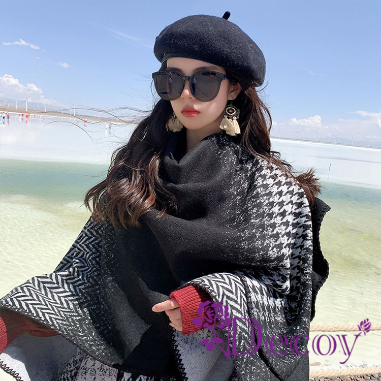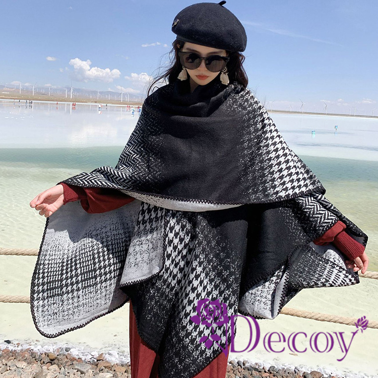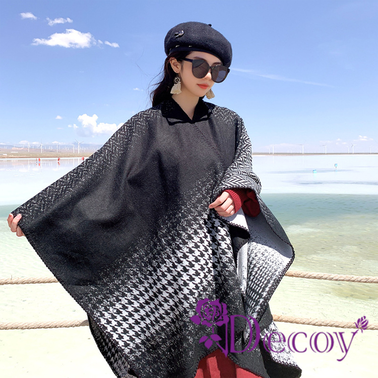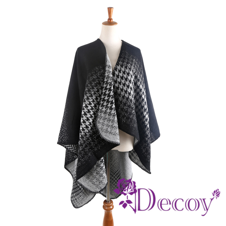 【Decoy】漸變千鳥 拼色人字紋加大保暖斗篷式披肩/黑白