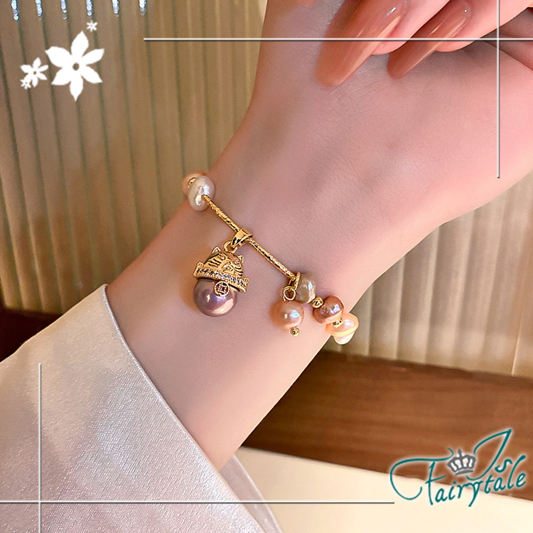 【伊飾童話】招財金貓 巴洛克風不規則天然珍珠伸縮手鍊