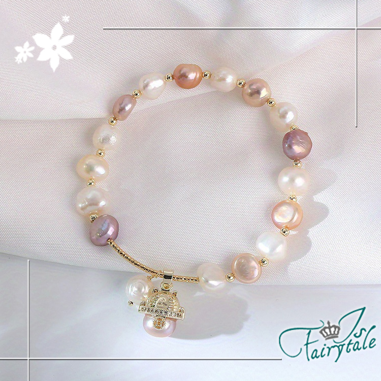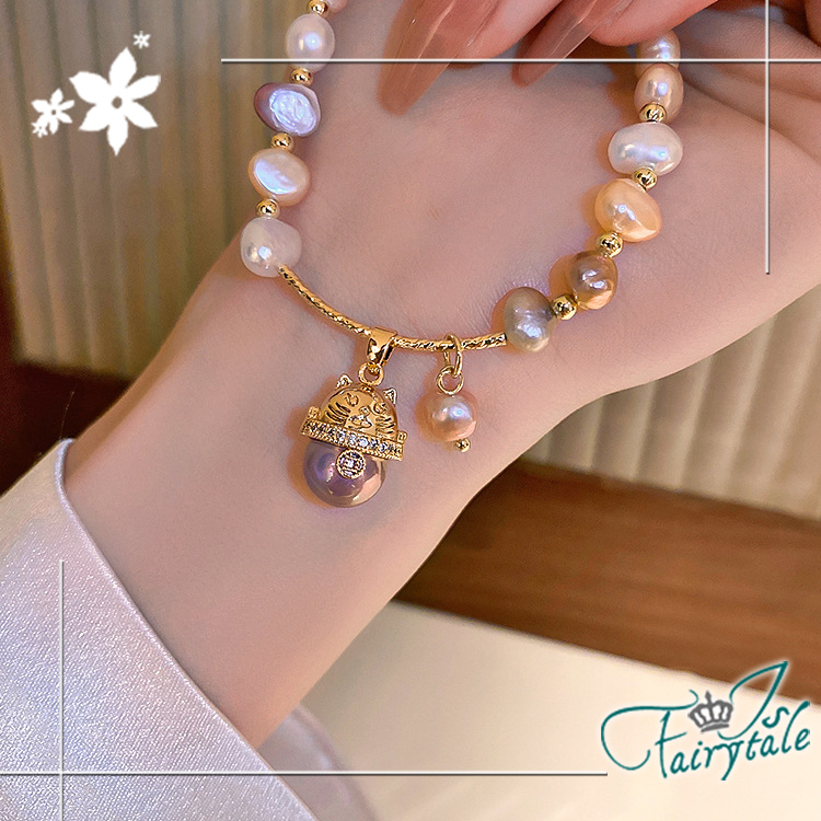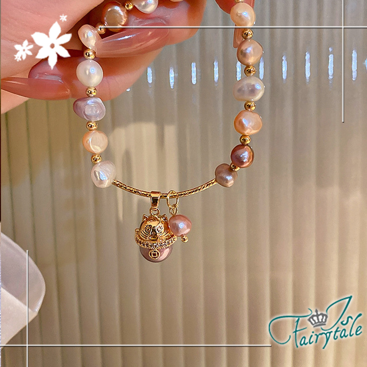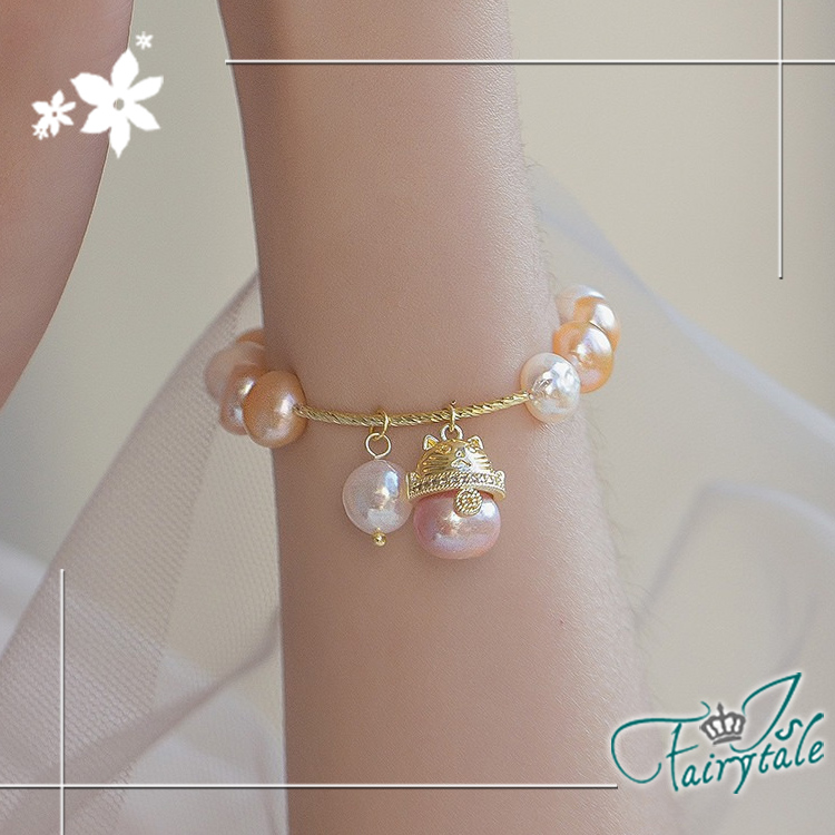 不規則天然淡水珍珠串造型設計,金色小貓點綴其中,