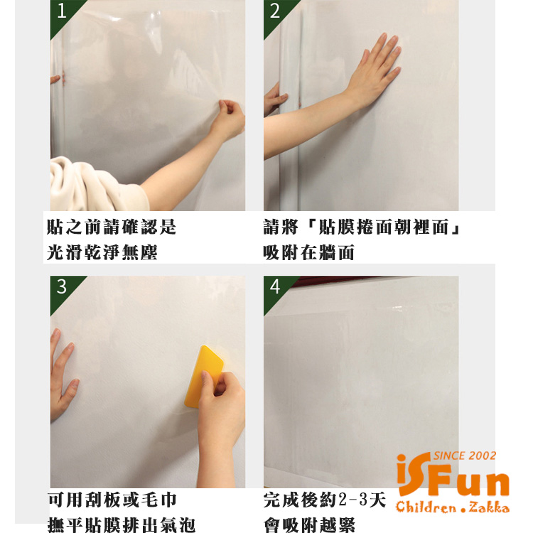 安裝方式:先將要貼的地方打掃乾淨不留水氣和灰塵,先展開測試需要的尺寸再裁切,展開貼膜吸附在牆面上,可用刮板或毛巾撫平貼膜排出氣泡,完成後約2-3天會吸附越緊,剛貼時勿觸摸