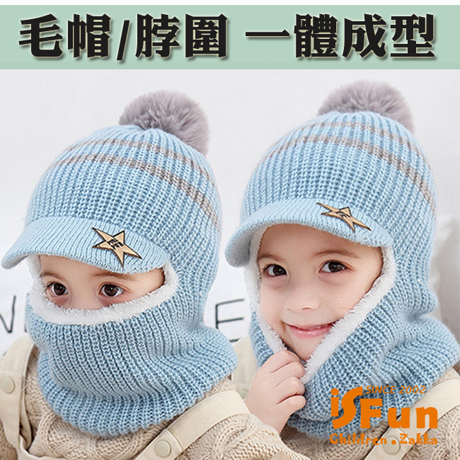 【iSFun】鴨舌星星*連體兒童加絨套頭脖圍毛帽/淺藍